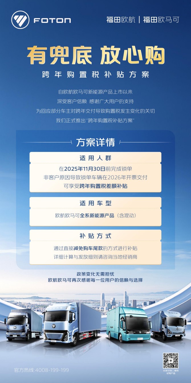 客戶需在2025年11月30日24:00前,與福田公司或福田授權(quán)經(jīng)銷商簽訂購車合同并支付定金完成鎖單,就有機會享受購置稅差額補貼政策。當(dāng)出現(xiàn)非客戶原因?qū)е略撴i單車輛在2026年開票交付的情形時,客戶可享受跨年購置稅差額補貼,具體的補貼細(xì)則可咨詢當(dāng)?shù)亟?jīng)銷商。