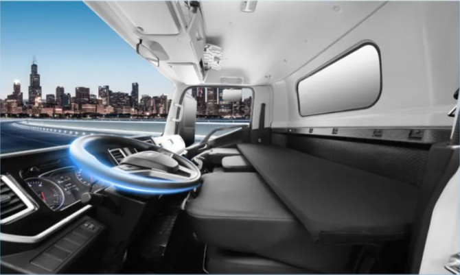 駿鈴A9大金牛駕駛室采用2090mm行業領先超寬體設計,內寬達1850mm,并設置了長度超過1837mm的超級臥鋪,1.8米身高成人可輕松躺平。車內設置超過160L的分布式儲物空間,便于分門別類收納隨車物品與工具。寬敞布局緩解壓抑感,并可選氣囊減震座椅,提升長途駕駛舒適性。