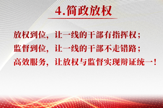 24個(gè)字其四,簡(jiǎn)政放權(quán)。主要讓一線干部有指揮權(quán),當(dāng)然,這背后不能缺少必要的監(jiān)督和高效服務(wù),最終要實(shí)現(xiàn)放權(quán)和監(jiān)督的辯證統(tǒng)一。這一點(diǎn)和國(guó)家層面的管放服一致,足以看出在發(fā)展路線上,譚旭光有條主線,那就是跟著國(guó)家政策路線節(jié)奏走。正是在他的帶領(lǐng)下,一線的干部才不會(huì)走錯(cuò)路。