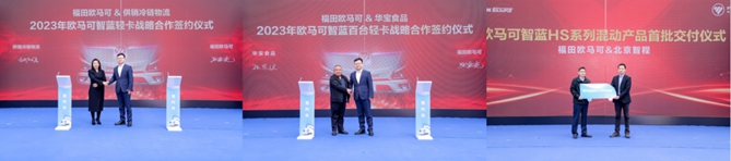 得益于強大產品力的加持及超值的政策,歐馬可智藍HS系列混動產品一經上市即贏得用戶的高度認可,上市即熱銷。活動現場,歐馬可智藍不僅與湖南供銷冷鏈物流、華寶食品簽署戰略合作協議,達成戰略合作,更向北京智程交付了2023年度百臺訂單的首批車輛。