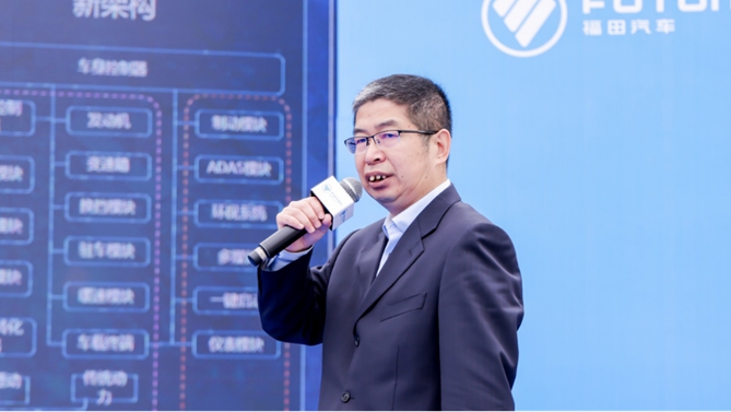 【福田汽車工程研究總院輕卡技術中心主任張文明講解歐馬可智藍E系列純電產品】