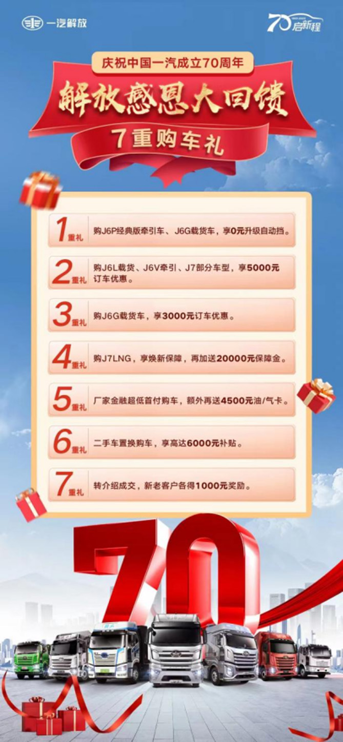 為獻(xiàn)禮中國(guó)一汽70周年華誕,感恩用戶厚愛(ài),一汽解放近期特別推出包括超低首付購(gòu)車、二手車置換優(yōu)惠等在內(nèi)的“七重禮”回饋廣大卡友;同時(shí),解放品牌共計(jì)70輛“特惠車”即將在線上搶購(gòu);近期到店用戶,還將有機(jī)會(huì)享70周年“進(jìn)店禮”……諸多精彩內(nèi)容就在當(dāng)下,不容錯(cuò)過(guò)!
