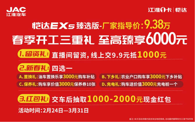 愷達(dá)EX5臻選版采用線上直銷模式,全網(wǎng)統(tǒng)一價(jià),最大程度讓利用戶,讓您買得??!2024年2月24日-3月31日,參與活動(dòng)領(lǐng)取春季開工三重禮,將新車開回家!