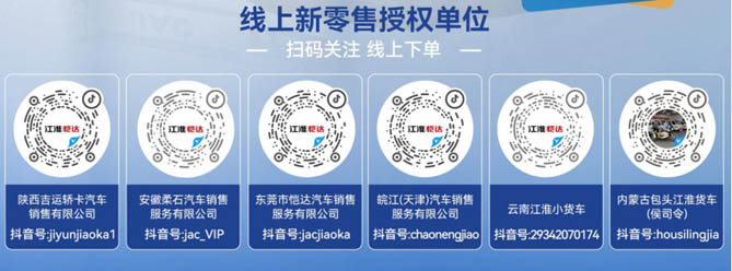 打開抖音掃碼關(guān)注或搜索以下任意一家授權(quán)單位即可快速下單。下單后,購車流程透明、速度更快。江淮1卡會(huì)將車輛運(yùn)輸至您所在城市,并由當(dāng)?shù)亟?卡經(jīng)銷商聯(lián)系您交尾款、提車。線上下單、線下包郵到家,買車方便省心!