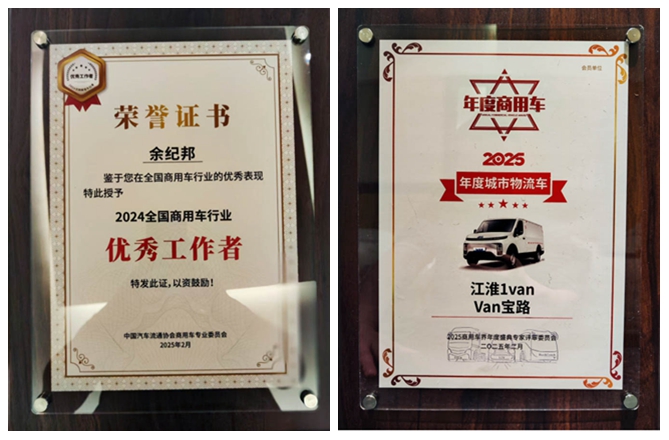 大會現場,江淮新能源輕卡EV5、江淮1van Van寶路兩款新能源車型重磅亮相,VAN卡奔騰閃耀全場。Van寶路更是憑借卓越產品實力,在2025商用車界年度盛典中一舉斬獲“2025年度城市物流車”大獎,余紀邦榮膺"2024全國商用車行業優秀工作者"稱號!