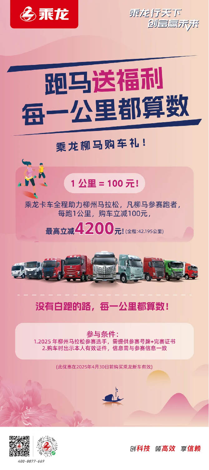 乘龍柳馬購車禮,跑馬拉松送福利,每一公里都算數(shù)!乘龍柳馬購車禮:1公里=100元。乘龍卡車全程助力柳州馬拉松,凡柳馬參賽跑者每跑1公里,購車立減100元,最高立減4200元!(全程:42.195公里)