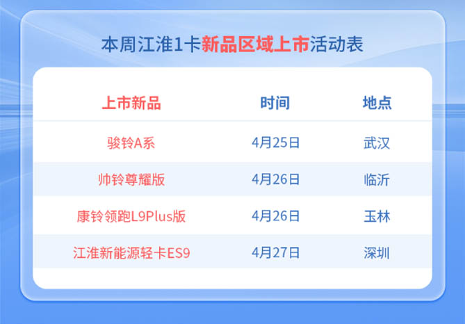 四月春暖運輸忙,江淮1卡四款新品,江淮新能源輕卡ES9、帥鈴尊耀版、駿鈴A系、康鈴領跑L9Plus版分別登陸深圳、臨沂、武漢和玉林,以"全場景解決方案"推動中國物流產業向高效化、智能化、綠色化躍遷。