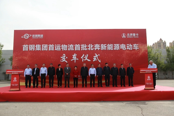在內蒙古自治區黨委、政府,包頭市委、市政府的大力支持和牽線搭橋以及在合同落地執行上給予的全方位溝通和協調下,5月10日,北奔重汽在技術中心院內舉行首鋼集團首運物流首批北奔新能源電動車交車儀式。