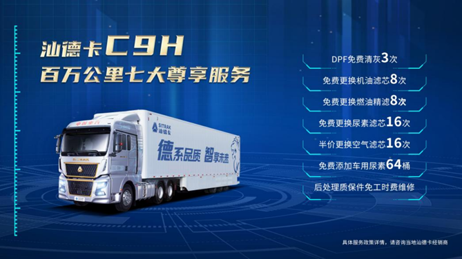 作為高端重卡的佼佼者,汕德卡C9H深入踐行“客戶滿意是我們的宗旨”核心價值觀,為客戶帶來全面領先行業的百萬公里七大尊享服務,汕德卡C9H客戶可在100萬公里內享受DPF免費清灰3次、免費更換機油濾芯8次、免費更換燃油精濾8次、免費更換尿素濾芯16次、半價更換空氣濾芯16次、免費添加車用尿素64桶、后處理質保件免工時費維修等超值尊享服務,不僅可省下一大筆車輛維護成本,更可享受四大總成核心零部件5年超長質保 ,其邏輯不言自明,實力才是大膽承諾的底氣。