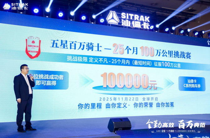 2025年11月22日,“全勤高效 百萬典范——汕德卡25個(gè)月100萬公里榮耀騎士頒獎(jiǎng)典禮”在中國(guó)·衡水盛大啟幕。本次盛典是對(duì)再創(chuàng)百萬榮耀奇跡的禮贊,亦是對(duì)汕德卡再赴高效傳奇的期許。行業(yè)精英代表齊聚一堂,共同見證汕德卡G7S燃?xì)廛噭?chuàng)下“25個(gè)月100萬公里”的行業(yè)新紀(jì)錄。
