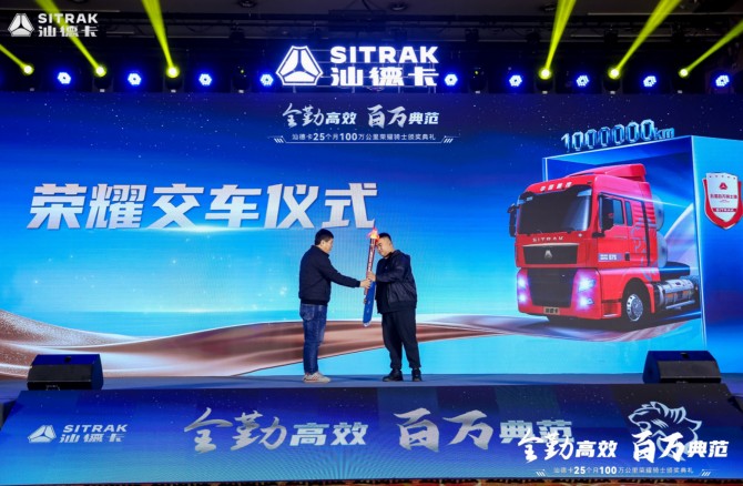 "全勤高效 百萬典范——汕德卡25個(gè)月100萬公里榮耀騎士頒獎(jiǎng)典禮"圓滿收官,本次典禮不僅見證了25個(gè)月100萬公里的突破性成就,更傳遞出汕德卡“全勤高效,每公里皆價(jià)值”的品牌追求。中國(guó)重汽汕德卡將繼續(xù)以匠心品質(zhì)推動(dòng)中國(guó)高端重卡行業(yè)向上而行,攜手合作伙伴駛向高效物流的嶄新未來。