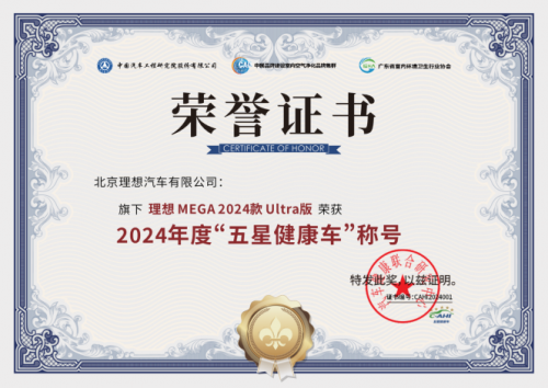 “五星健康車” 是由汽車健康聯合研究中心基于中國汽車健康測評指數(C-AHI)結果頒發的榮譽稱號,也是目前國內汽車市場中的健康乘用車榮譽形象。在2023版測評新規程中,理想MEGA和理想L6雙雙拿下“五星+”的最高評級,且分別位居純電車型和混動車型歷史第一名,拿到了雙狀元。在清新空氣、健康防護和綠色出行三個維度均獲得最高評級,為全家人提供全方位的健康環境。
